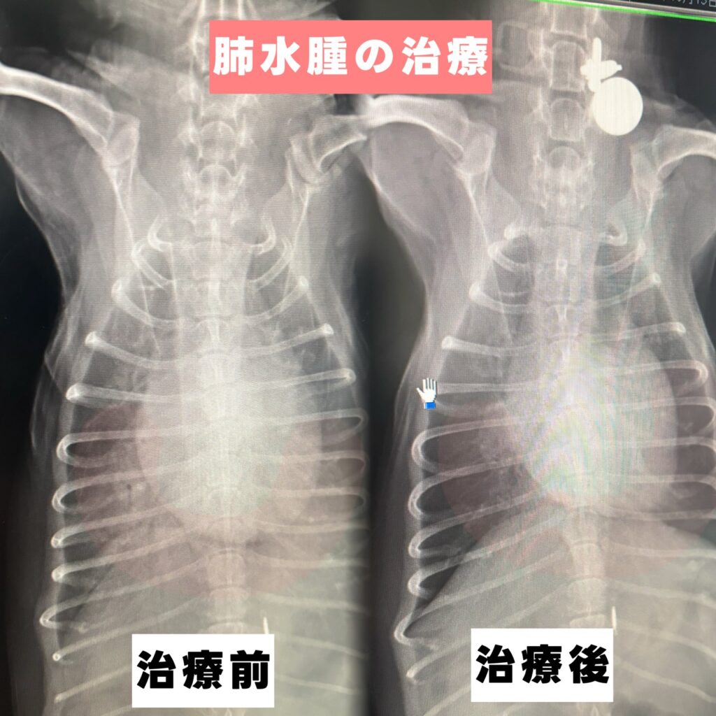 MRの治療歴あり、レントゲン撮影で肺水腫と診断。